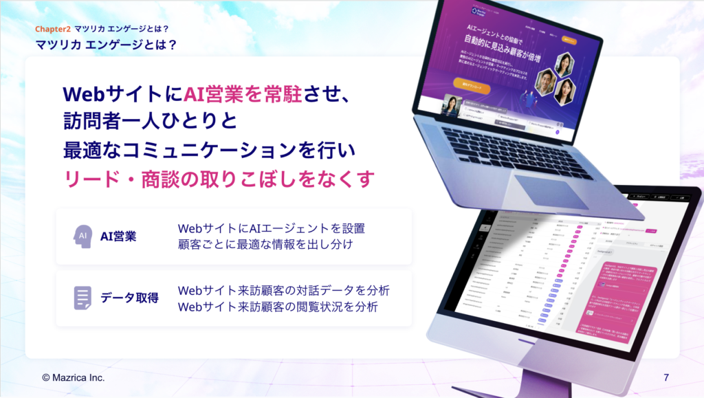 2025年4月に提供を開始した「Mazrica Engage」は、「ただの看板」となっているWebサイトを、訪問者ごとにコンテンツを出し分けるパーソナライズされたWebサイトへと進化させます。これにより、WebサイトのCVRが1%前後に留まる問題を根本から改善します。