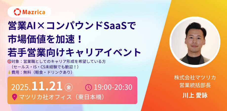 株式会社マツリカは、11月21日(金)にキャリアイベント「営業AI×コンパウンドSaaSで市場価値を加速!若手営業向けキャリアイベント」を開催いたします。