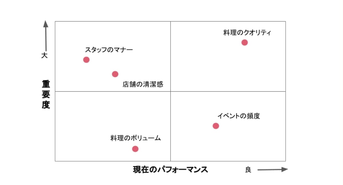 - 左上のエリア:重要度が高いが評価が低い要素(改善の優先度が高い)