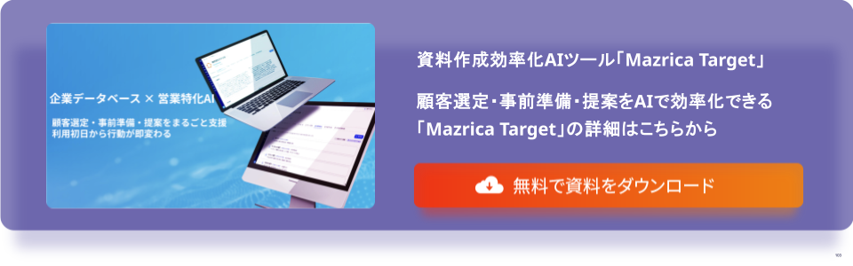 営業活動をさらに高度化したい場合は、営業特化型AIツールであるMazrica Targetの活用も有効です。顧客データをもとにターゲット選定やアプローチの最適化を支援し、成果創出を後押しします。