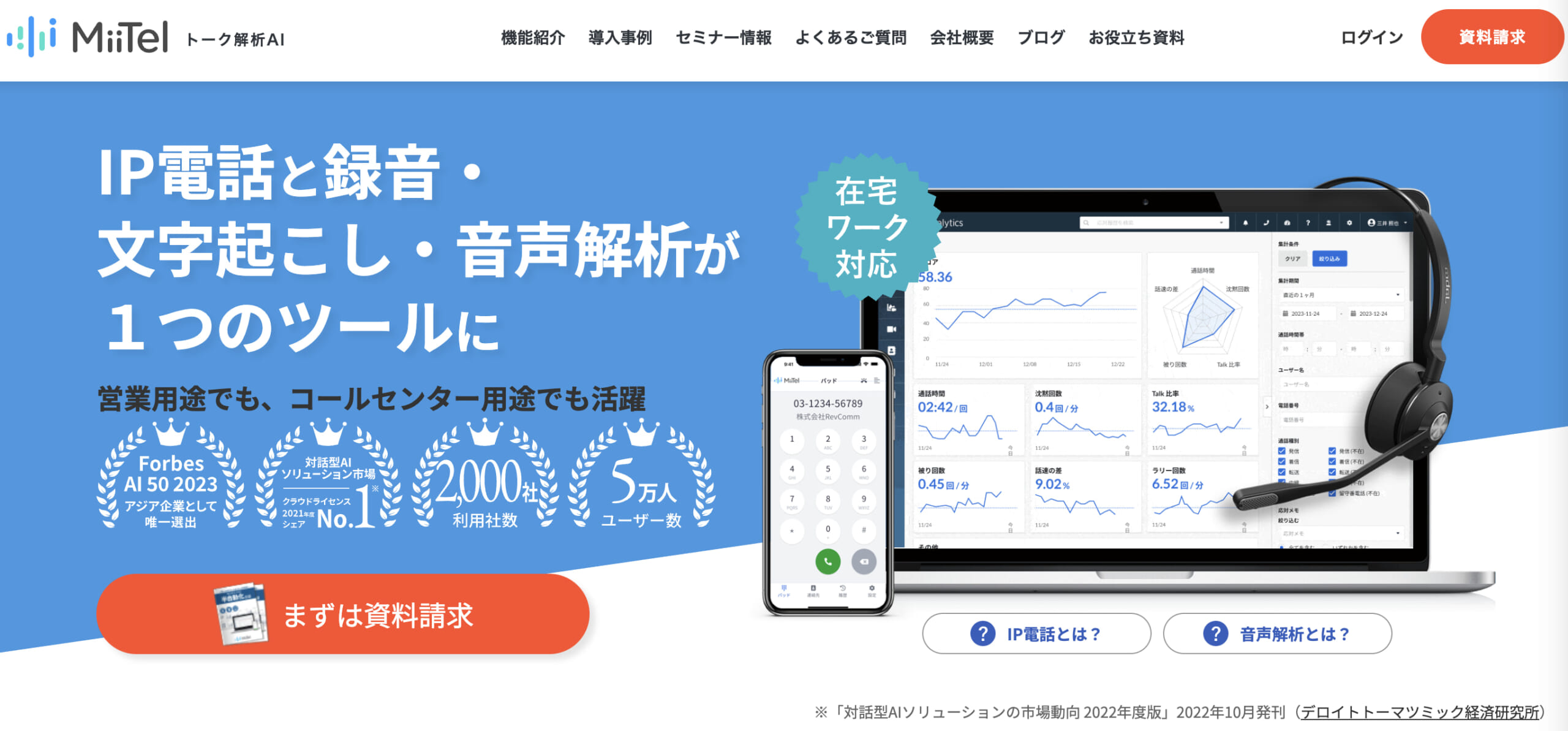 | Miitel | 通話内容解析 | ・電話等の会話を解析しコミュニケーションを最適化・会話データから顧客インサイトを提供 |