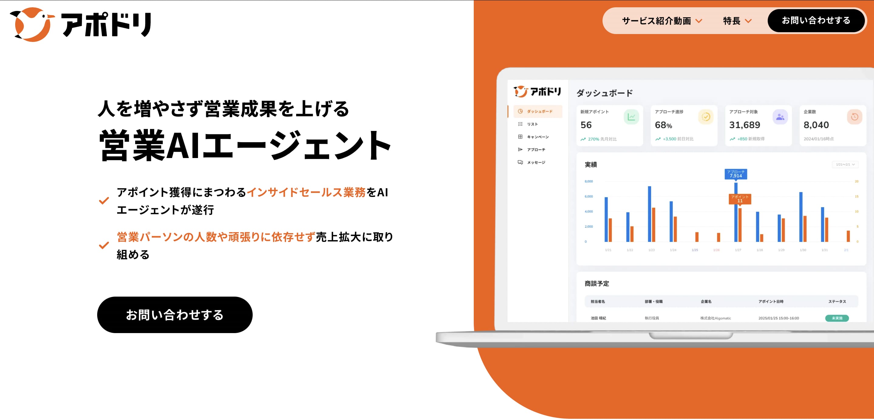| アポドリ | アポイント獲得 | ・リード抽出からアポイント獲得までを自動化・自社の営業プロセスに合わせカスタマイズが可能 |