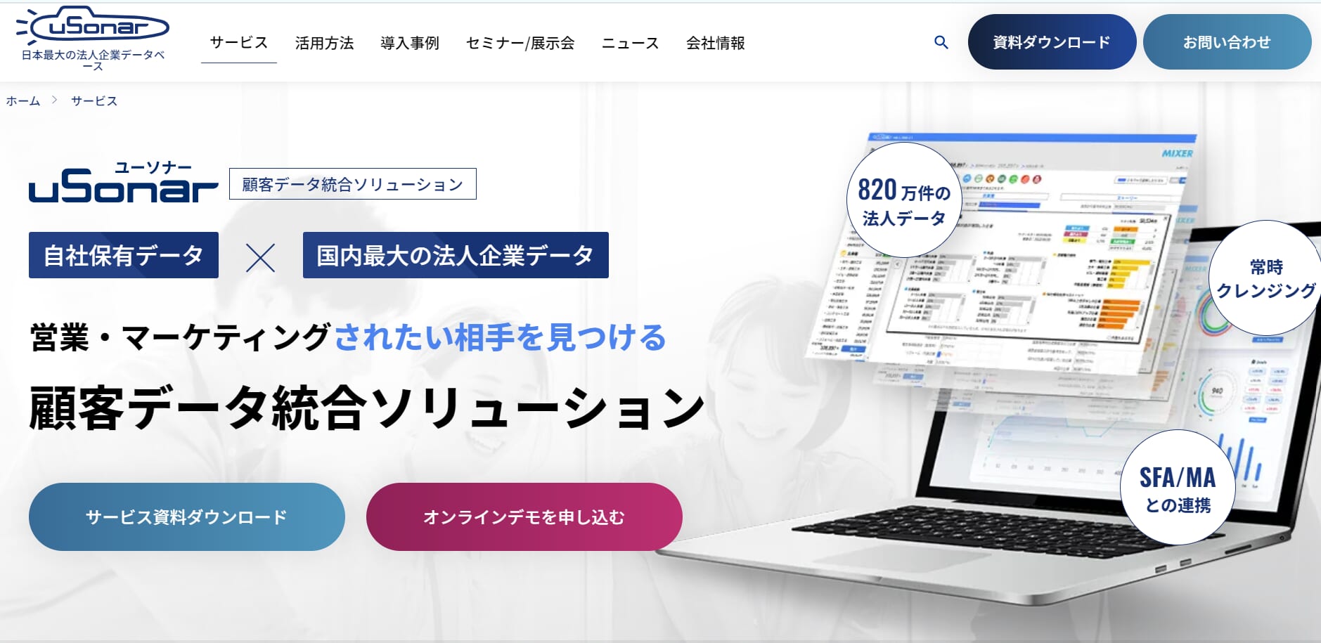 SFAやCRM(SalesforceやHubSpotなど)と連携する機能もあり、既存データの重複や情報漏れを解消するデータ整備にも対応しています。