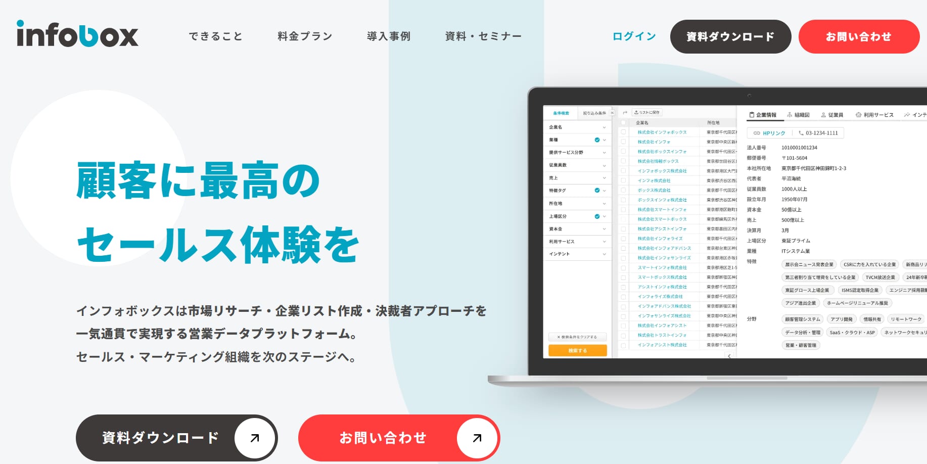 infoboxは、企業・人物・導入サービスといったデータを統合し、BtoB営業を強力にアシストするプラットフォームです。セールス組織全体の活動を支え、効率化と成果向上に貢献します。